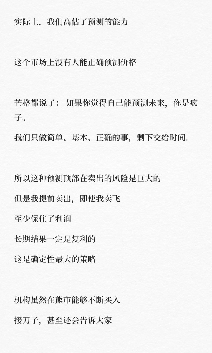 芒格说过一句话:如果你觉得自己能预测未来,你是疯子。没有人能准确预测顶部。但有一件事是确定的——只有兑现的利润,才是你真正的钱。