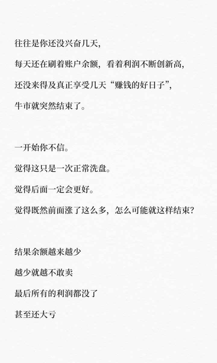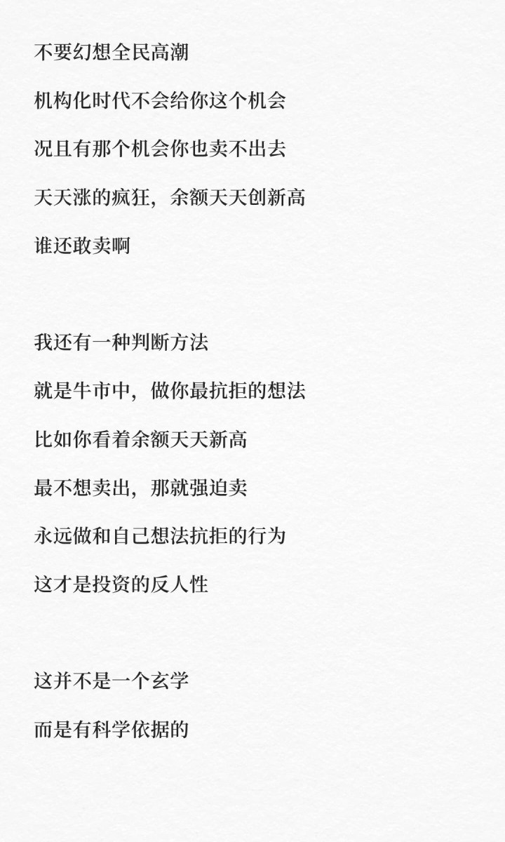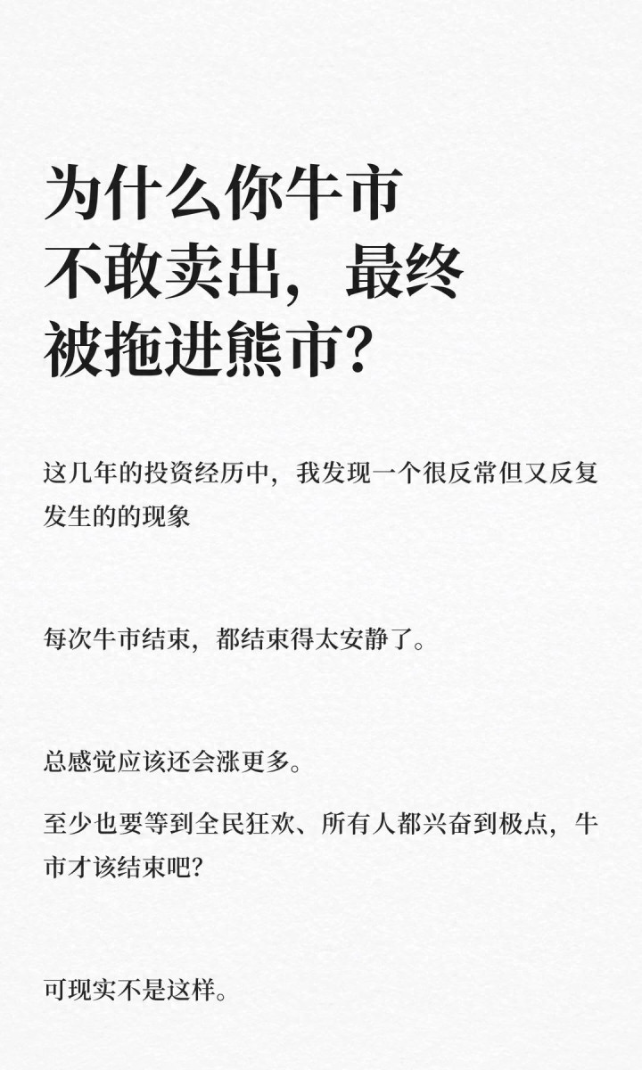 而牛市里,早期建仓的人获利盘最大,他们最有动力卖。一旦买盘撑不住卖盘,牛市就该结束了。所以,在你最抗拒卖出的时候,恰恰是最该分批卖的时候。越抗拒,越要卖。