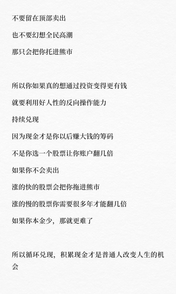 有了现金,你才能在下一轮熊市里,从容地捡便宜筹码。一轮一轮地循环兑现,才是普通人改变人生的机会。