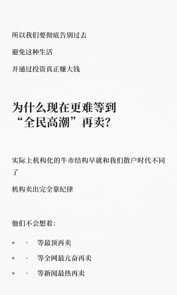很多人还在幻想:等大妈进场、等全民狂欢、等所有人都在讨论股票的时候再卖。但现实是,机构化时代,牛市顶点只会更加安静,不会给你这种机会。你以为的“刚刚开始”,其实已经是中后期了。