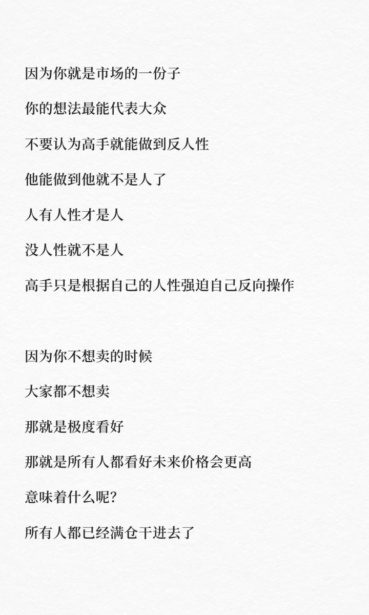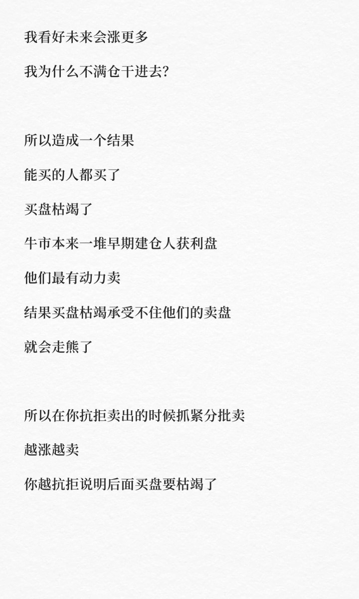 比如你看着账户余额天天创新高,最不想卖的时候,就强迫自己卖。为什么?因为你就是市场的一份子,你的想法最能代表大众。你不想卖的时候,大家都不想卖,那就是所有人都极度看好,意味着什么?意味着能买的人都买完了,买盘已经枯竭了。