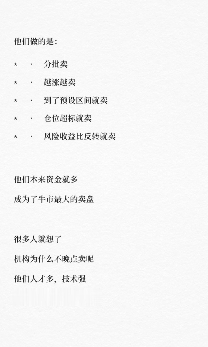 现在的市场,早就不是散户说了算的时代了。机构怎么卖?他们靠的是纪律——分批卖、越涨越卖、到了预设区间就卖、仓位超标就卖、风险收益比反转就卖。他们不会等全网最亢奋、新闻最热、所有人都喊着“冲”的时候再卖。